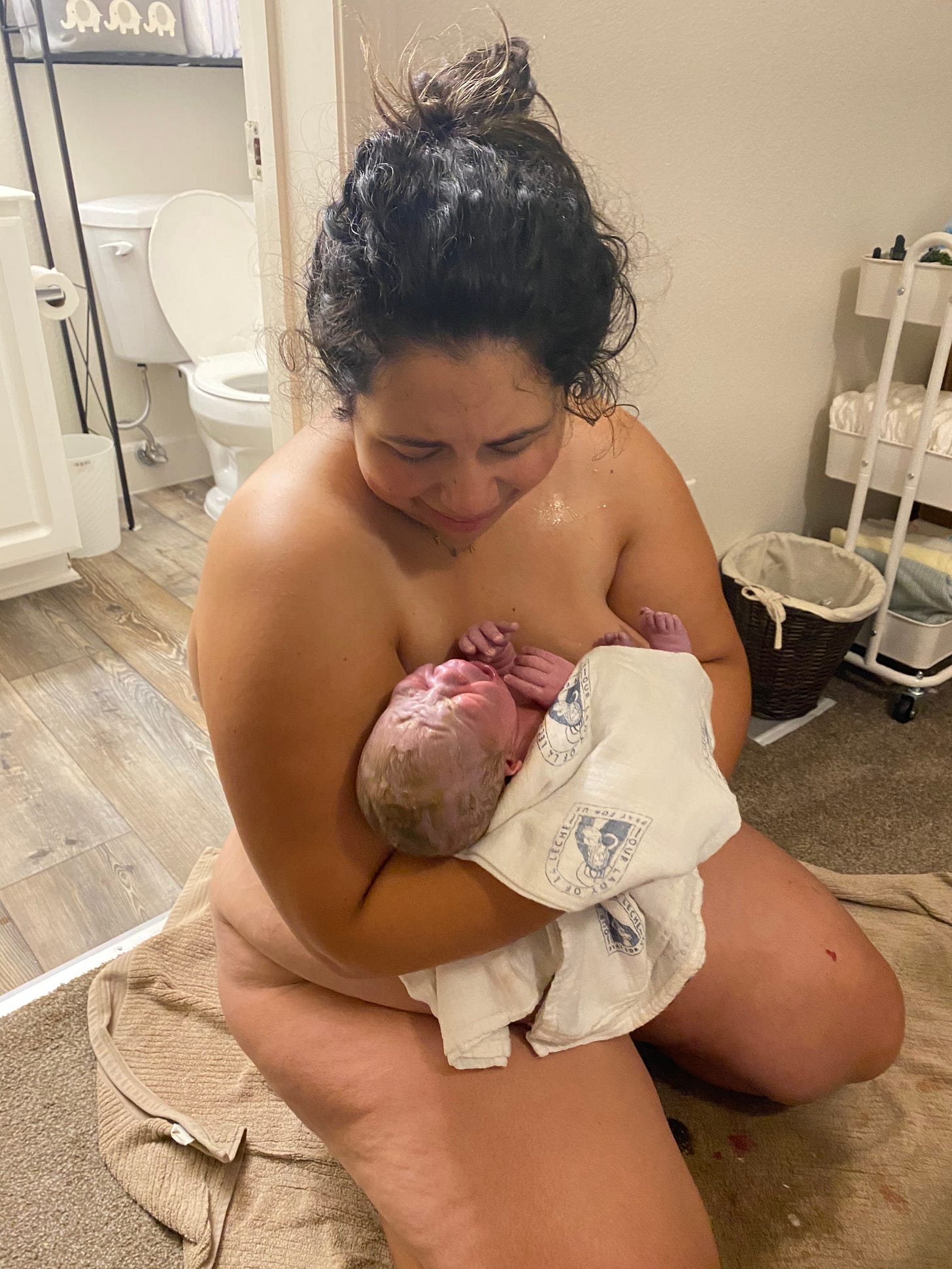 This is me, a few minutes after giving birth to my 3rd baby on the floor of my bedroom with only my husband present.
